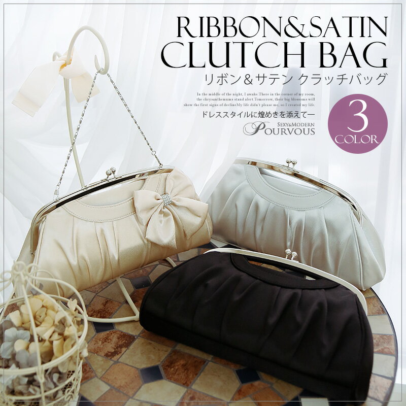 【結婚式サブバッグ】リボンとラインストーンがキュートなクラッチバッグ